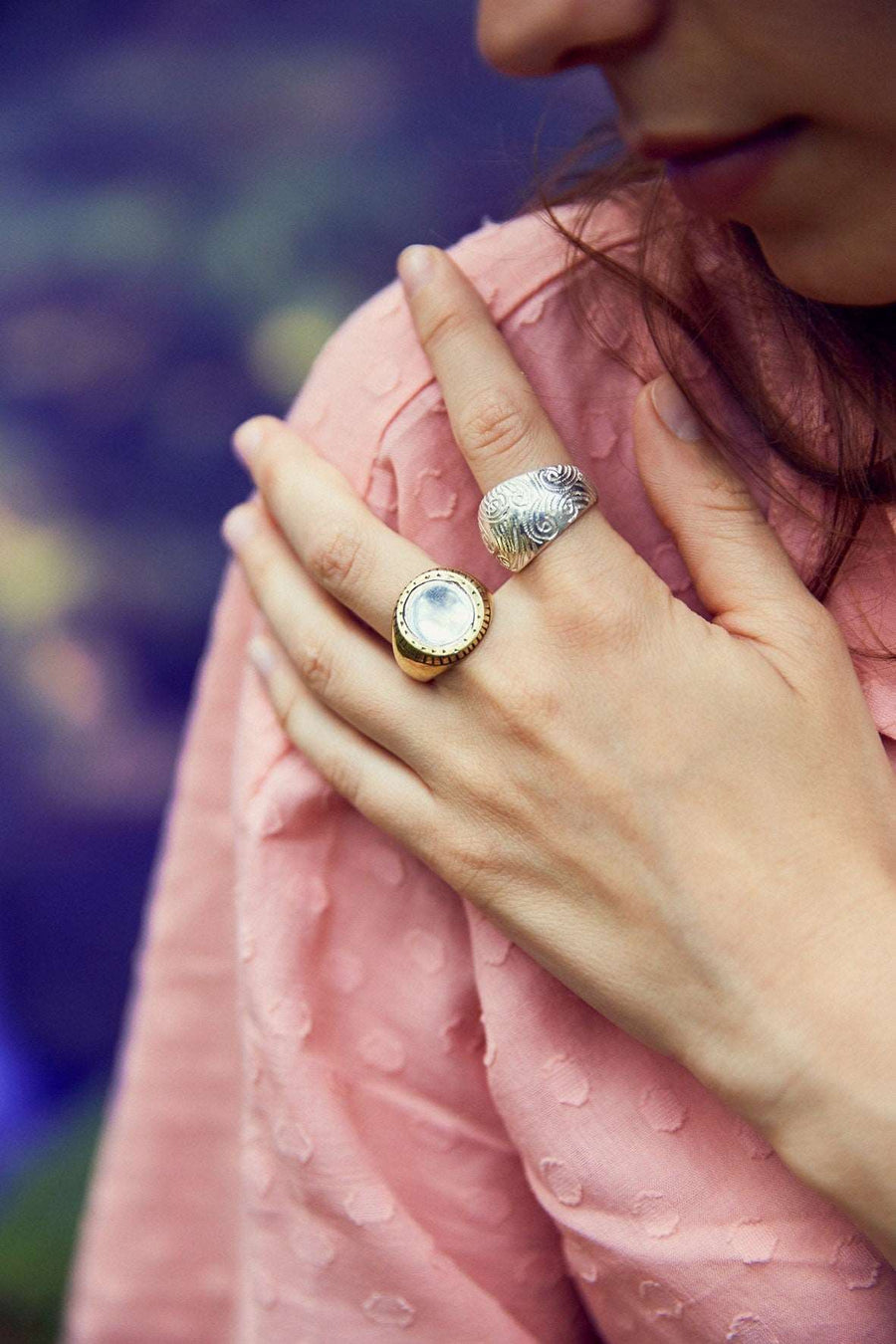 Cette bague fait parti de la collection « Le lit bleu ». Je l’ai dessiné en pensant au tableau de Chagall où des amoureux s’envolent dans un azur infini, en pensant à la sensation de flottement que j’éprouve lorsque je m’étends à la surface de l’eau à la mer, au bruit des vagues, à la manière dont elles ondulent, me berce. Je me sens comme une petite coquille flottante dans l’immensité. Cette bague est un petit creux protecteur, un petit nid douillet dans toute cette immensité.